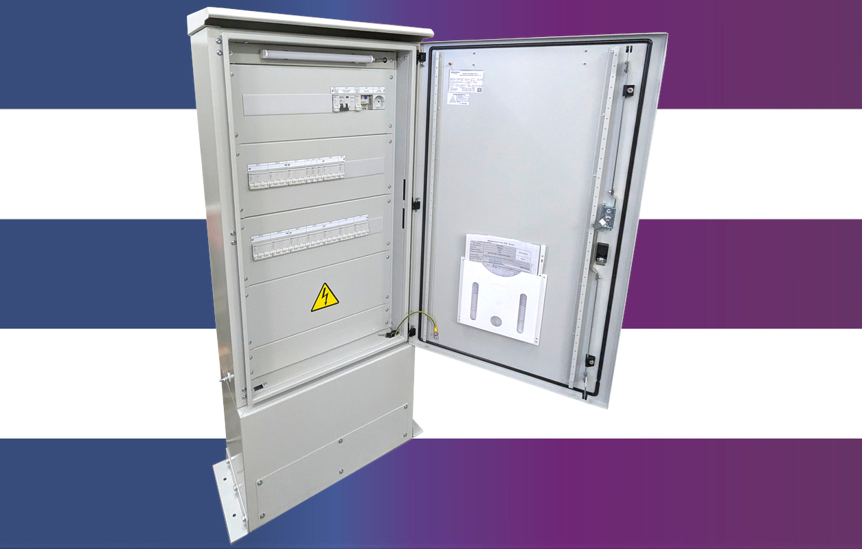 Устройство представляет собой цельнометаллический сварной корпус с выполненным разделением по форме 1. На задней стене корпуса установлены металлические направляющие, к которым прикреплено оборудование шкафа. На двери установлен запирающийся на ключ замок.