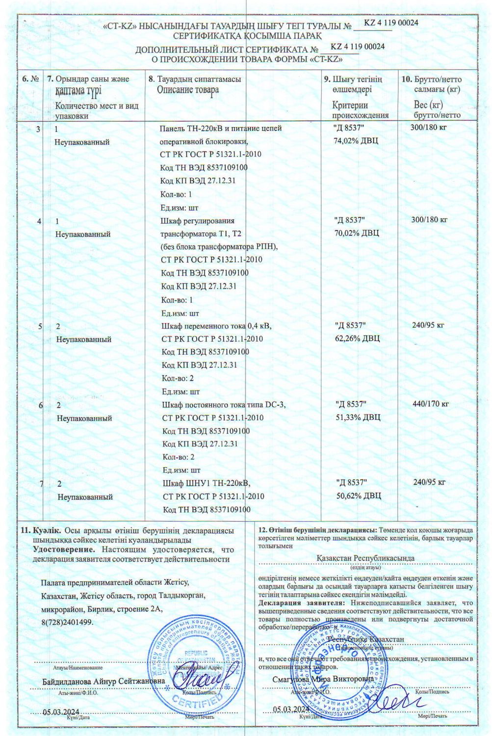Сертификат о происхождении товара: панель ТН-220кВ, ШРТ, ШПТ 0,4кВ, DC и ШНУ