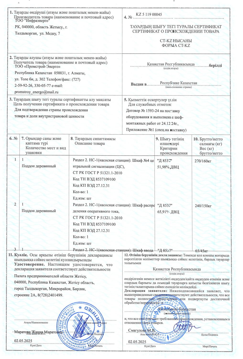 Сертификат происхождения товара: шкаф ЦС и шкаф распределения оперативного тока